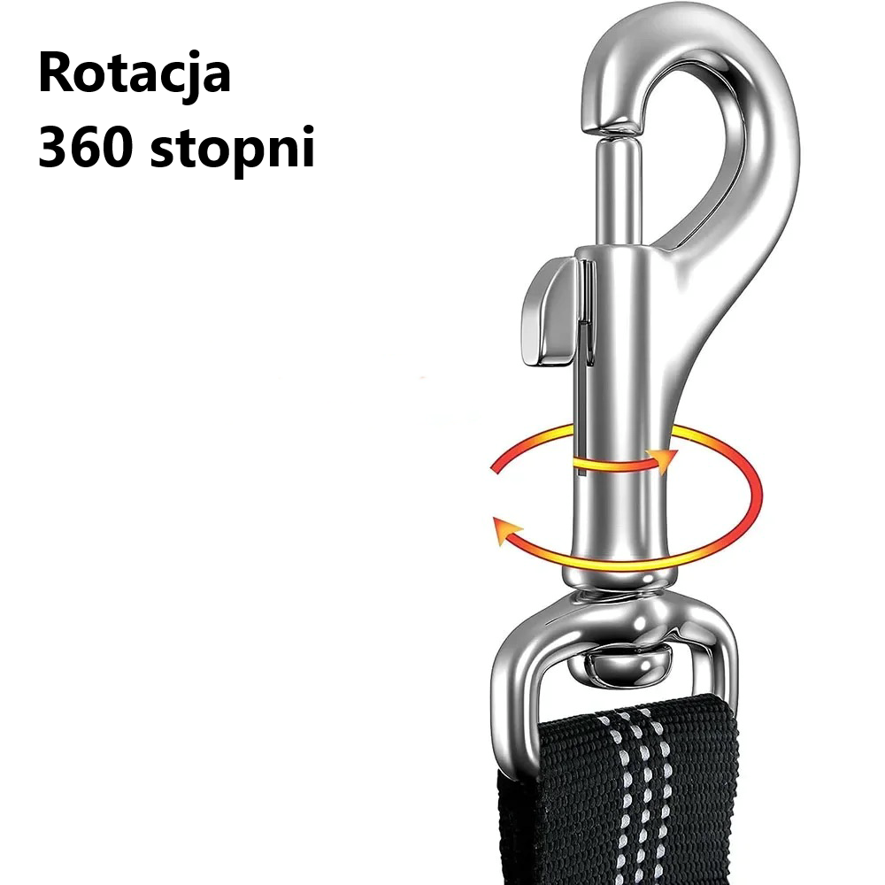 Dzięki obrotowemu karabińczykowi 360° smycz się nie plącze, a pies może się swobodnie poruszać w swoim obszarze.